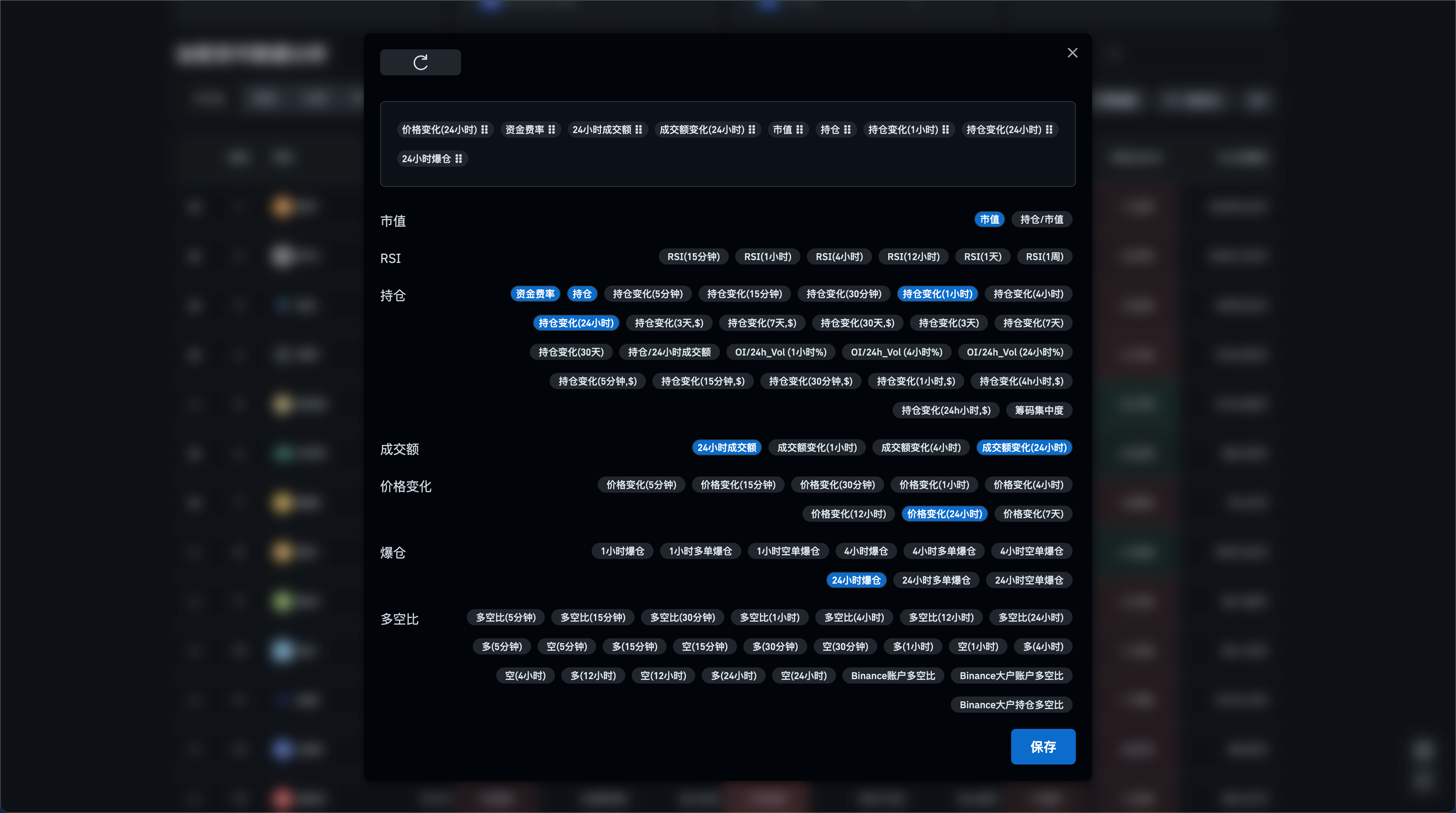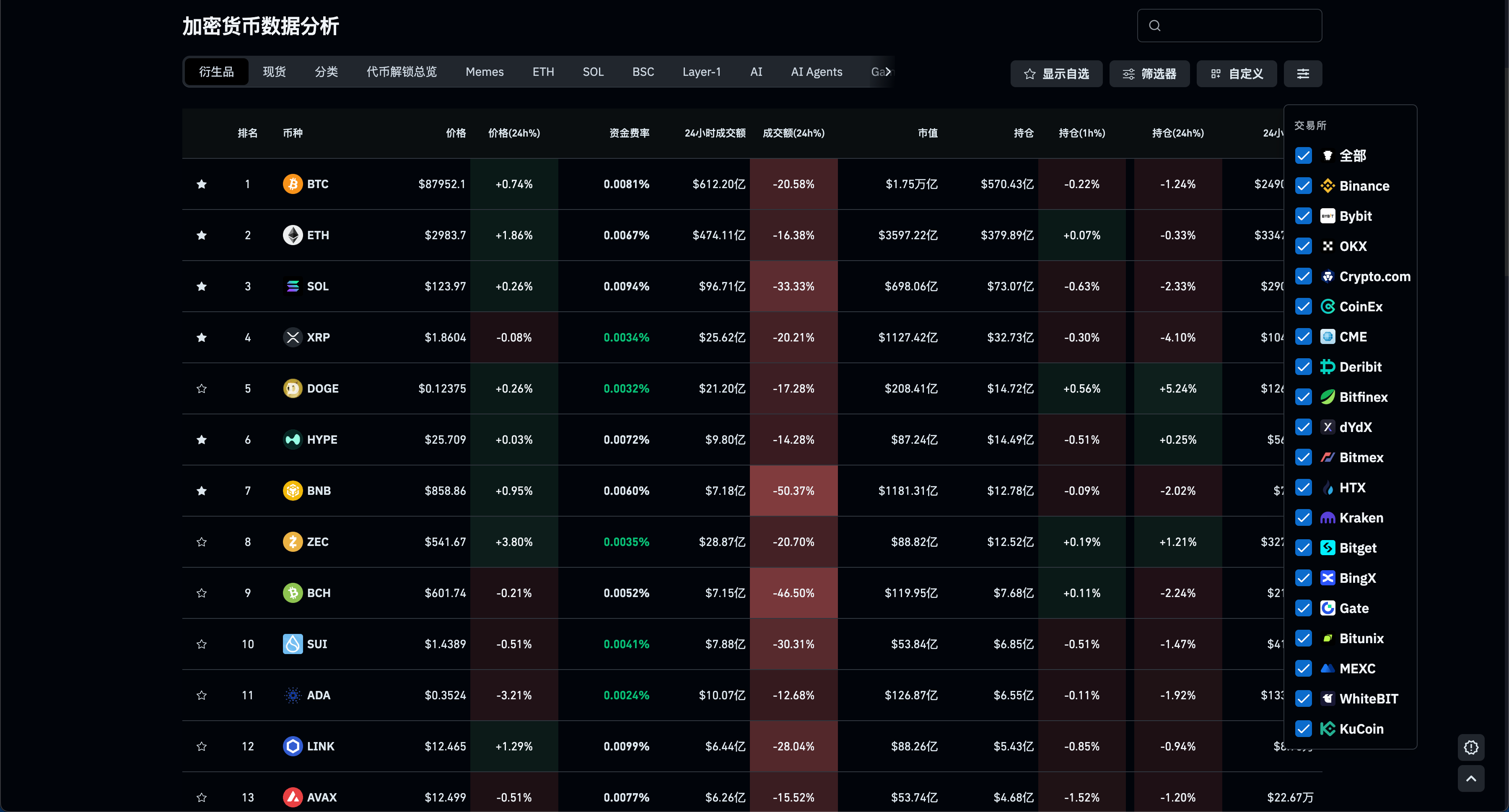 在这一栏中,可以通过右上角的筛选功能,筛选出你希望看到的交易所内容,当然我个人比较喜欢全选。然后是可以通过自定义功能,选择你最喜欢看的指标。我个人比较喜欢市值、持仓/市值、资金费率、持仓、持仓变化、价格变化、成交额、爆仓数据以及资金费率指标。当然你可以根据自己喜欢的指标进行自定义,我们给到了用户最大程度的自定义仪表,喜欢什么就用什么。