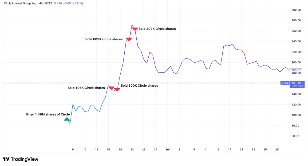 一次操作可能是巧合,两次或许是直觉,但 ARK 的加密交易展现出一种不同寻常的时机感。这是刻意为之,而非被动反应。证据就是,仅在 6 月和 7 月通过交易 Coinbase 和 Circle 的股票,他们就斩获了超过 2.65 亿美元的利润。