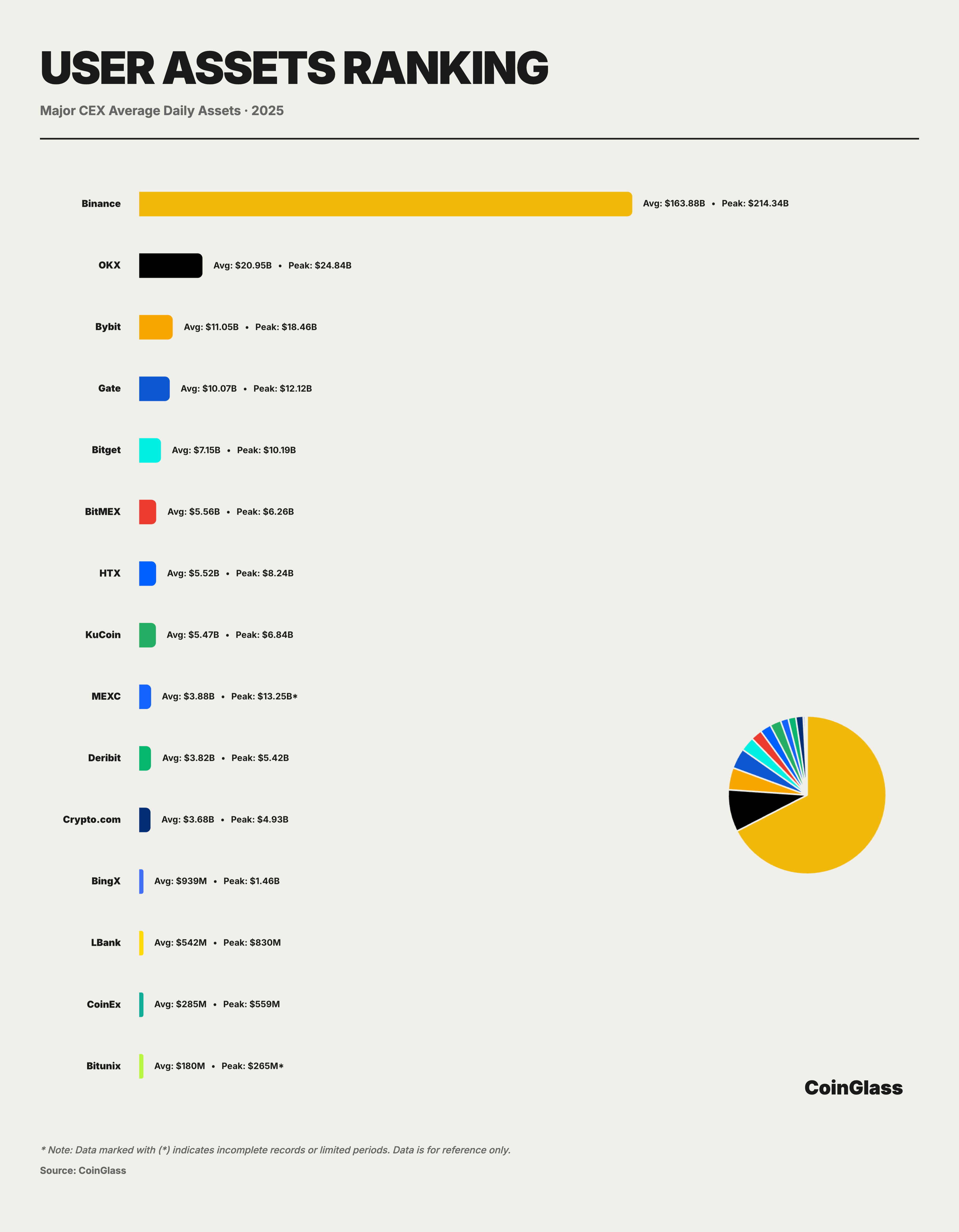 OKX 以約 210 億美元的日均資産和 248 億美元的峰值位居第二,規模約爲第三名 Bybit 的兩倍,顯示出其在用戶資金留存和中長期資産沉淀上的優勢。但這種雙極 + 多家腰部平颱的結構,意味着資金托管風險在前兩名平颱高度集中,一旦任一平颱在合規、技術或運營層麵出現尾部事件,其外溢效應將遠超單個平颱本身的市佔比。 在第二梯隊之後,市場進入了競爭更爲激烈的百億級區間。Bybit、Gate 與 Bitget 分別約 110.5 億、100.7 億與 71.5 億美元日均資産,共同構成次頭部資産承載層。前五家平颱合計吸納了超過 90% 的用戶資産,用戶資金高度集中。