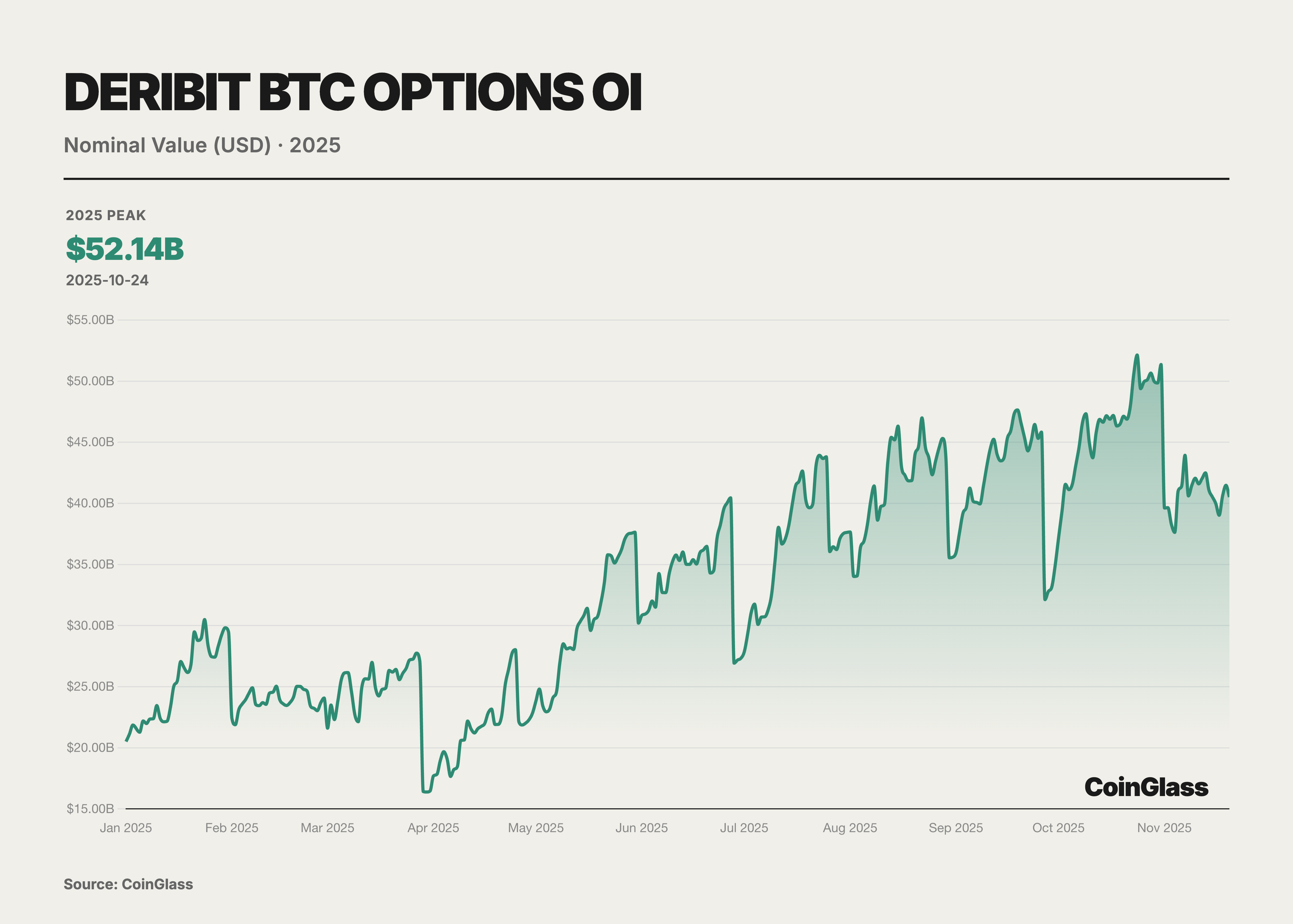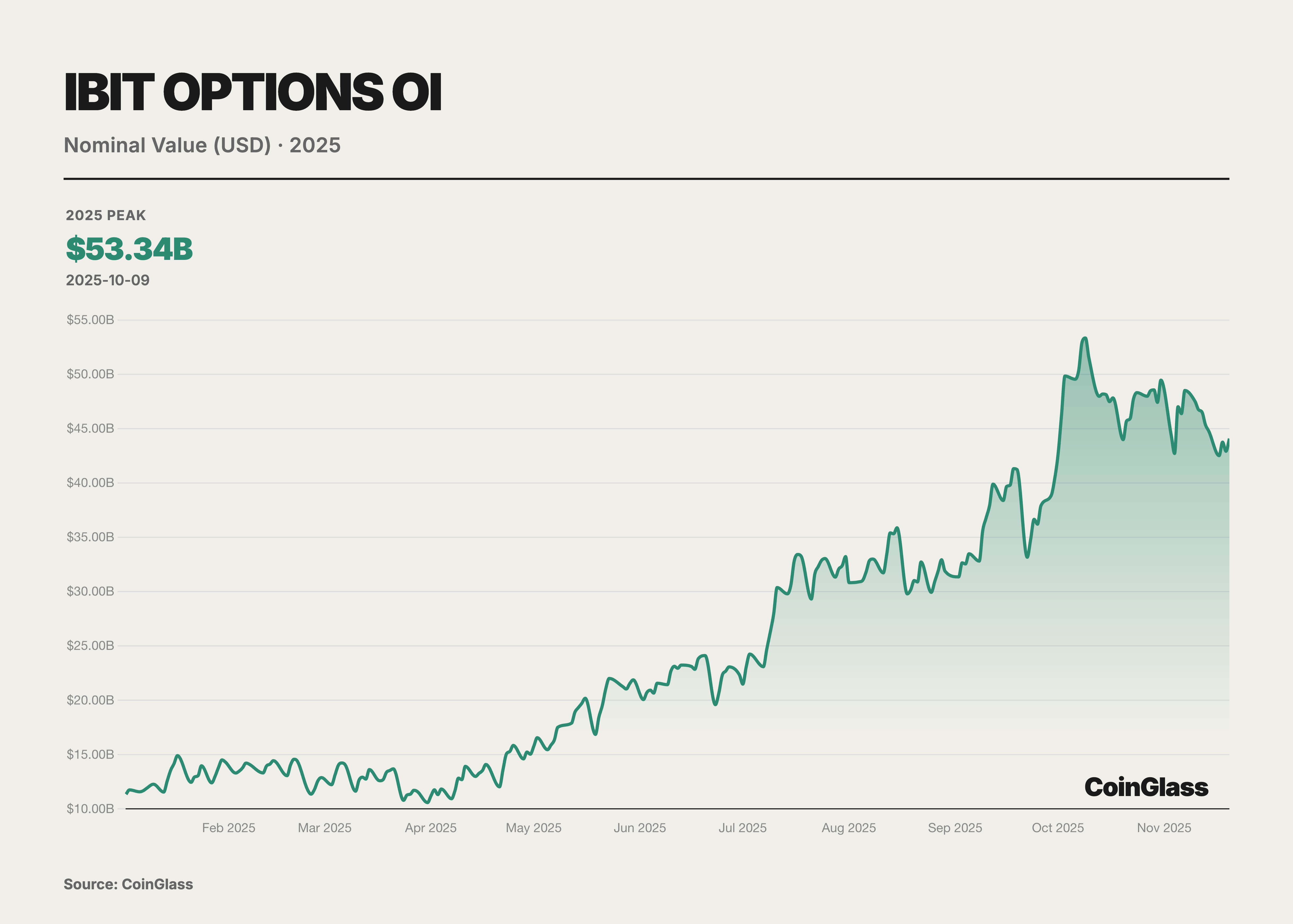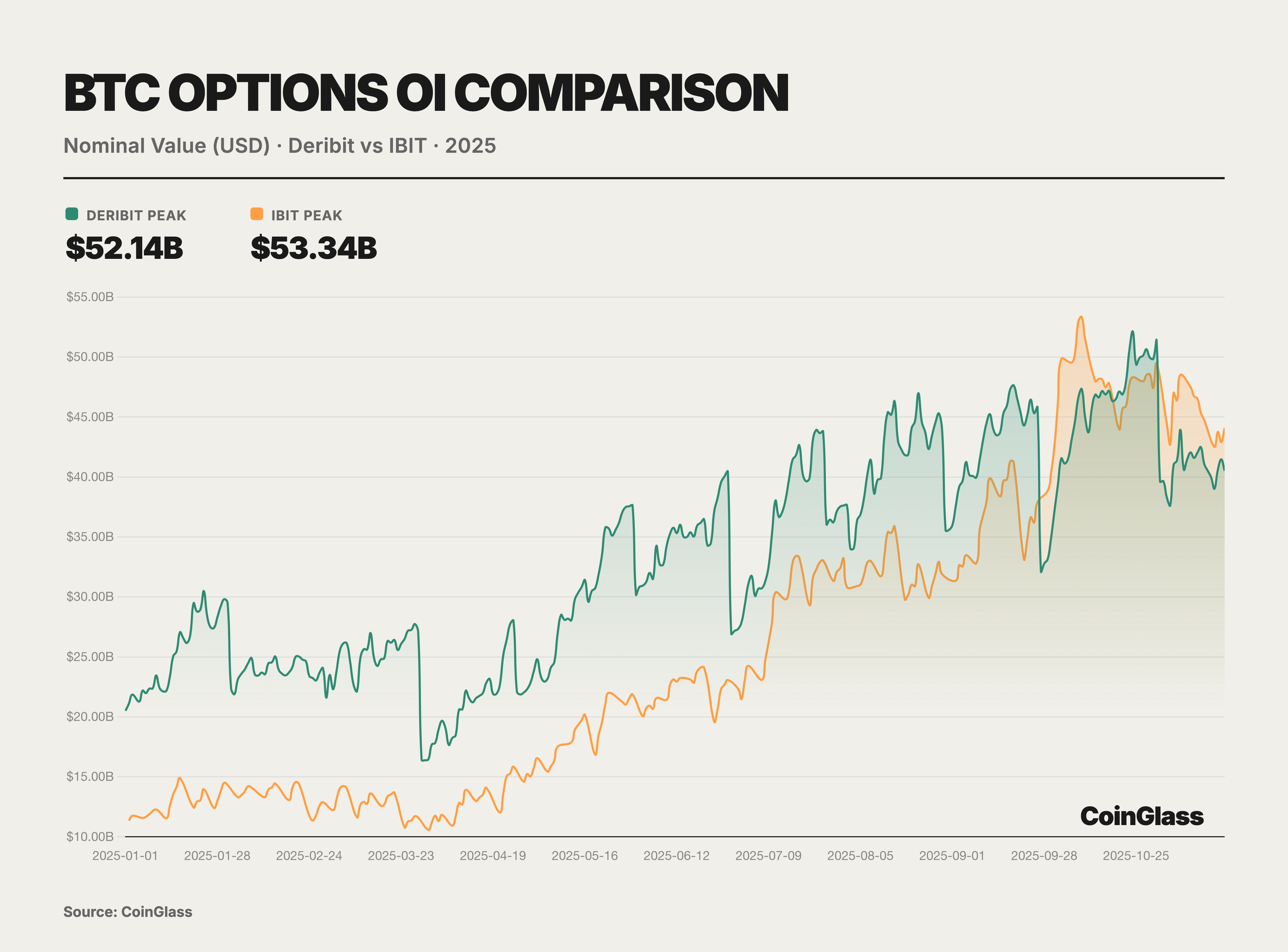 本年度期權市場的核心敘事由兩大裡程碑事件定義,這兩大事件共同重塑了全球數字資産的定價權邏輯。首先是美國最大的合規交易所Coinbase以29億美元完成對離岸期權巨頭Deribit的收購,這一並購案不僅標誌着傳統合規交易所對原生加密流動性的整合,也重新定義了全球衍生品交易的基礎設施格局 。其次,BlackRock旗下IBIT ETF期權的崛起,並在2025年第三季度末在持倉量上首次超越長期霸主Deribit,標誌着傳統金融資本已正式在波動率定價權上與加密原生平颱分庭抗禮。在此之前,Deribit 一直享有近乎壟斷的優勢,截至2024年底,Deribit 控製着約85%的全球加密期權市場份額。