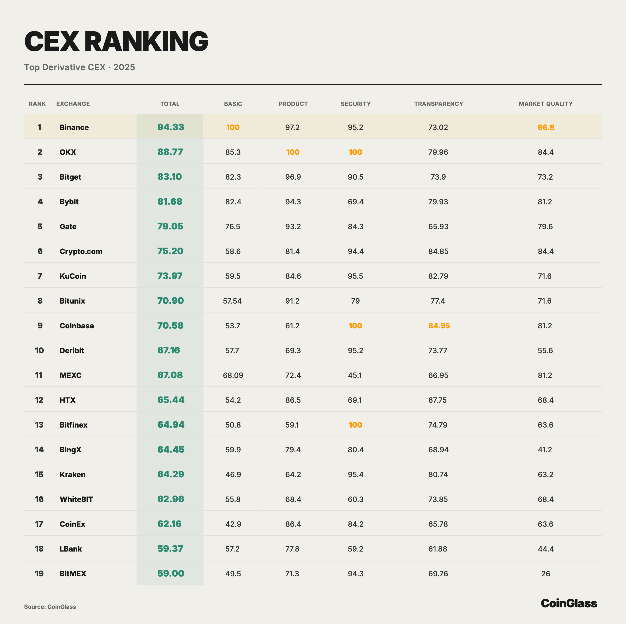 爲將衍生品交易在 CEX 側的頭部集中從體量敘事進一步落到可比較的質量維度, CoinGlass 對主要衍生品 CEX 進行了綜合評分與排序。下圖以基礎交易數據爲核心權重,並從産品、安全、透明度與市場質量等維度給出分項得分與加權總分,從而直觀呈現不同平颱在流動性承載、風控約束與信息披露上的結構性差距。