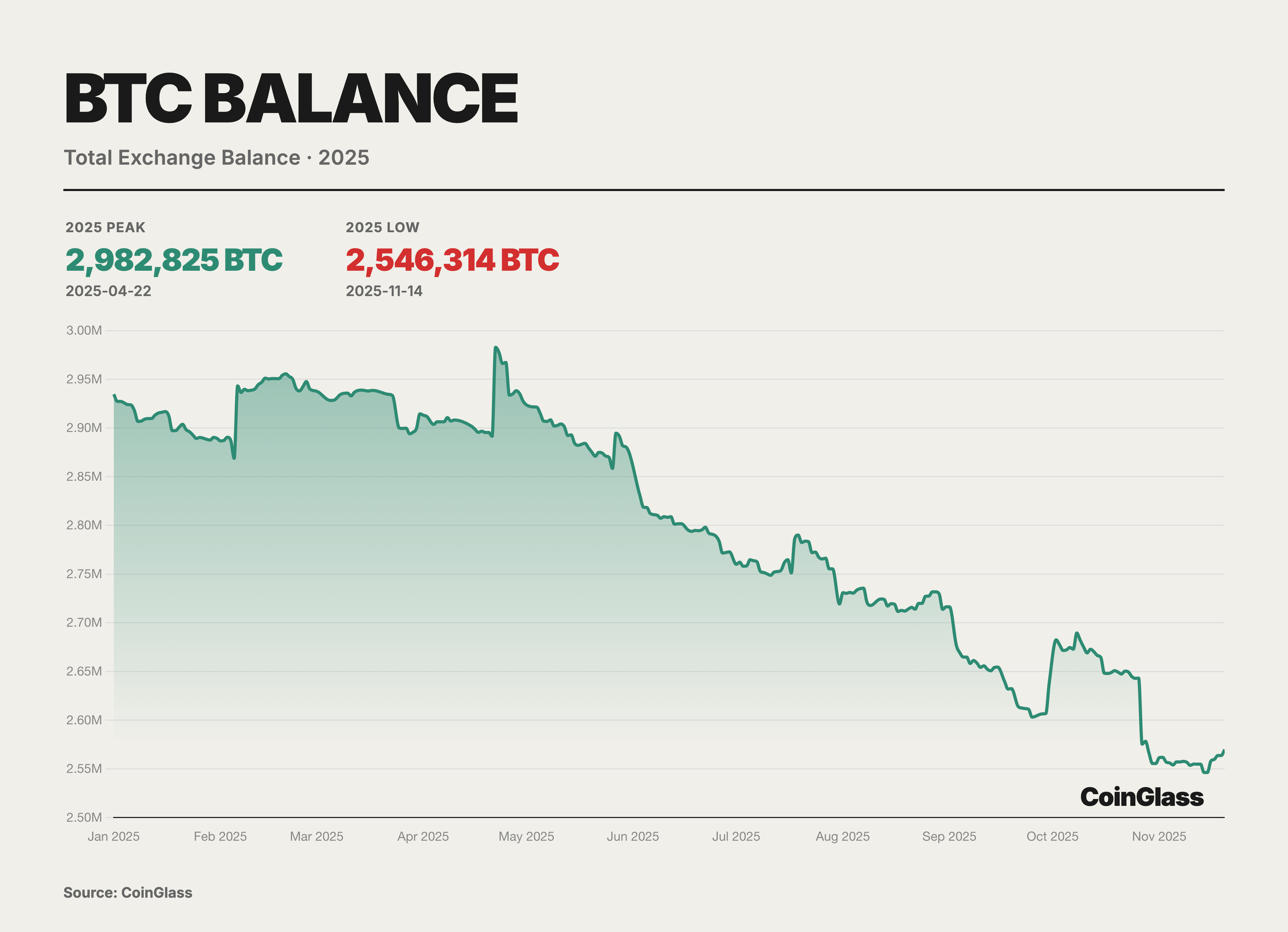 2025 年,BTC在交易所層麵的供給結構出現了明顯再平衡跡象,全網交易所餘額整體呈颱階式下行、從 4 月高點起進入持續去庫存階段。CoinGlass 數據顯示,自 4 月 22 日附近觸及約 298 萬枚的年內峰值後,交易所 BTC儲備在隨後數月整體呈階梯式下行,於 11 月中旬一度下降至約 254 萬枚,區間淨流出約 43 萬枚,降幅約 15%。