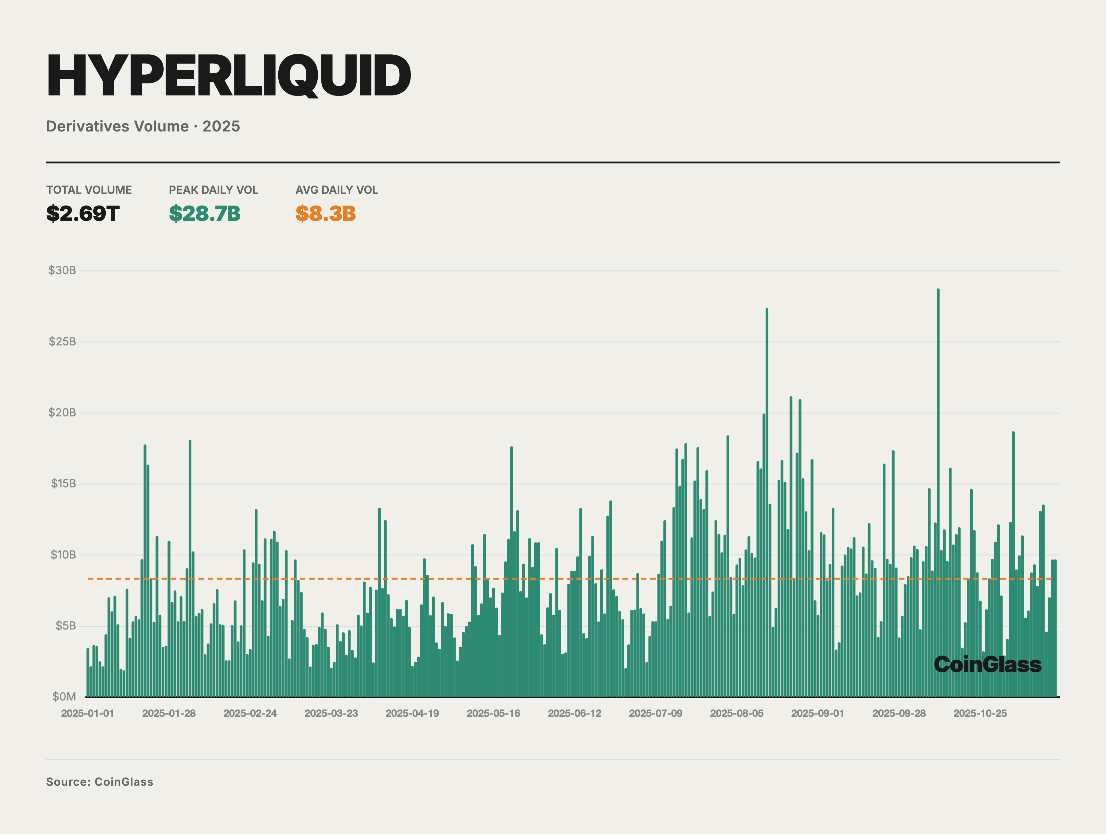 2025 年,加密衍生品市場總成交量約 85.70 萬億美元,日均成交約 2,645 億美元。在宏觀流動性環境依舊偏緊、風險偏好階段性修複的背景下,全年成交活躍度整體呈“先低後高、震盪抬昇”的結構。目前,衍生品已經成爲絶大部分主流資産價格形成與風險管理的主要場所。圖中橙色虛線所示的均值上方反複出現放量交易日,其中 10 月10 日單日峰值約 7480 億美元,顯著高於年內常態水平,反映出在行情加速階段,衍生品已成爲價格髮現與槓桿博弈的核心戰場。月度維度看,一季度日均成交額多在 2000 億美元,二季度起逐步走高,7–8 月及 10 月的日均水平抬昇至 3000 億美元以上。