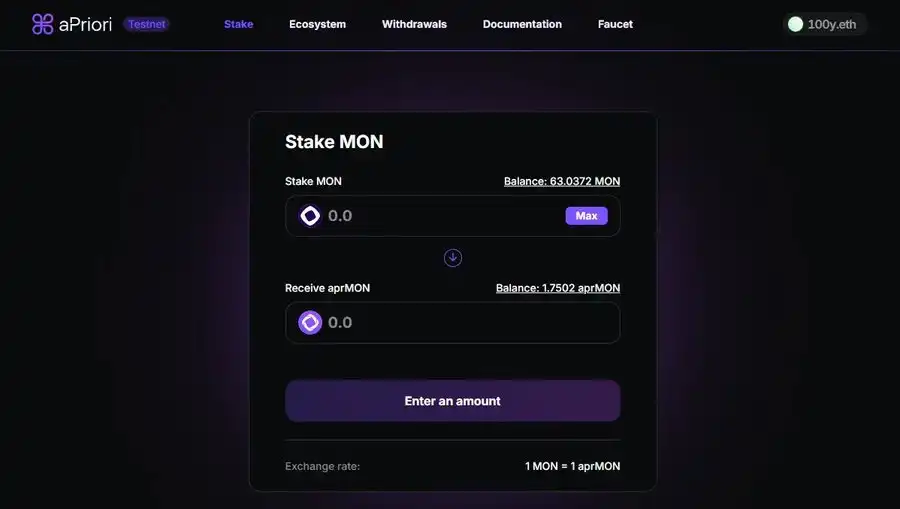 aPriori 于 2023 年从 Hashed 和 Arrington Capital 获得了 200 万美元的种子轮融资,2024 年 7 月从 Pantera、Consensys 和 Flow Traders 获得了 800 万美元的种子轮融资,并于 2025 年 8 月从 Pantera、HashKey 和 IMC Trading 获得了额外的 2000 万美元融资。这使得它成为 Monad 生态系统中资金最充足的 dApp 之一。用户可以在测试网上质押 MON 来获取 aprMON,并在各种 DeFi 协议中使用它。