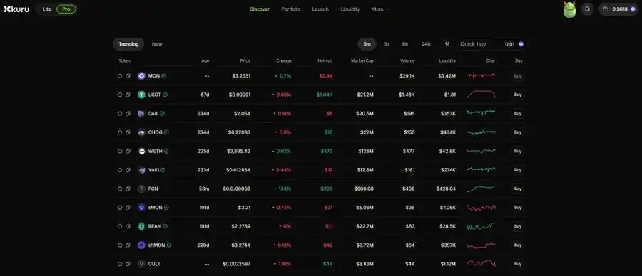 Kuru 提供两种模式:Lite 模式和 Pro 模式。在 Pro 模式下,用户可以通过订单簿交易不同代币并提供流动性;在 Lite 模式下,用户可以通过简单的兑换界面轻松使用订单簿流动性进行代币交易。
