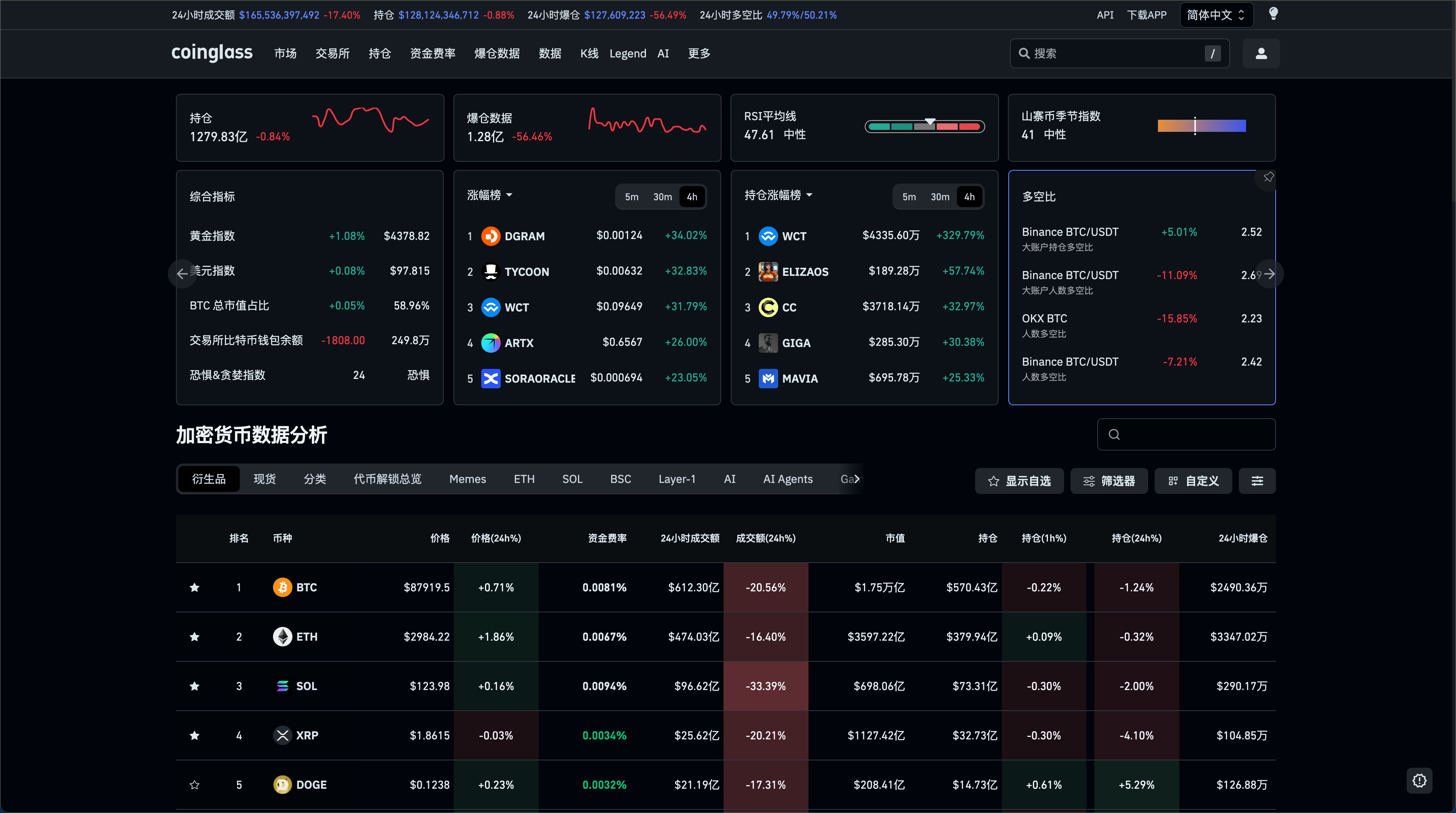CoinGlass 的首頁主要是對於加密貨幣衍生品市場的概覽,在最上方可以看到當前市場的熱點以及基本數據,並且可以選擇你喜歡的數據欄目向前置頂(通過點擊那個小小的“圖釘”圖示)。