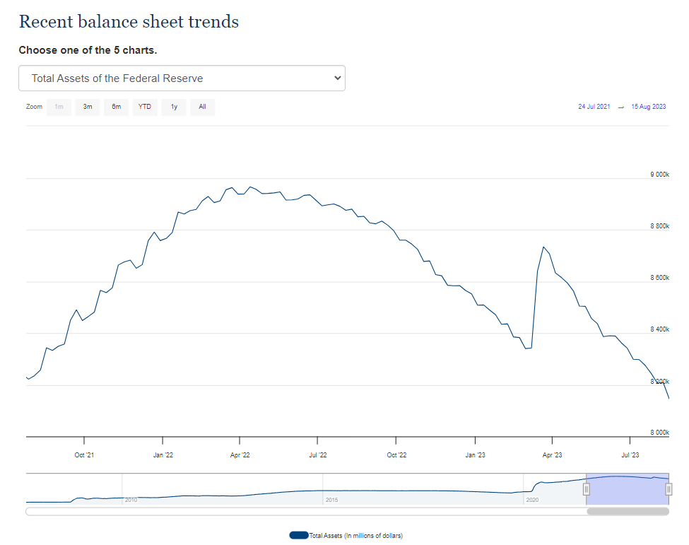 据美联储官网数据显示,截至 8 月 15 日,美联储资产负债表规模为 8.145 万亿美元,已缩表至 8.2 万亿美元以下。8 月 8 日至 8 月 15 日美联储共缩表 630 亿美元。