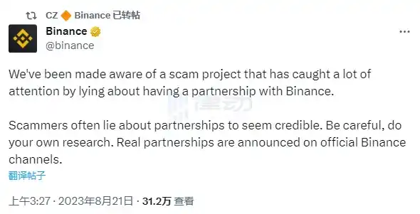 Binance:某诈骗项目谎称与 Binance 有合作关系,以获取广泛关注
