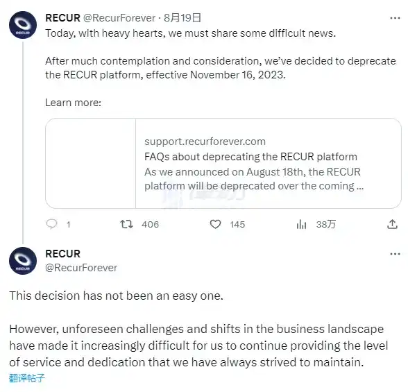 3. NFT 品牌体验平台 Recur 将关闭,曾获 5500 万美元融资;