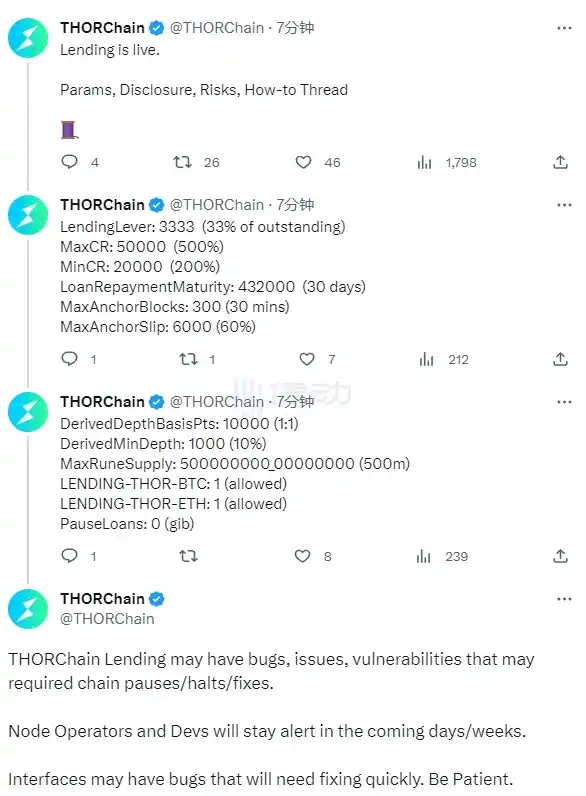 据官方消息,THORChain 借贷协议已上线。团队表示新上线的协议或存在部分 bug、漏洞,可能需要链暂停/停止/修复。