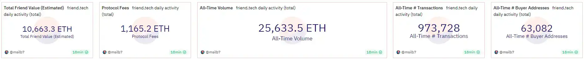 据 Dune 数据信息,社交协议 friend.tech 收入已超 1000 ETH,达 1165.2 ETH。协议交易总量达 25,633.5 ETH,当前用户总市值为 10,663.3 ETH。