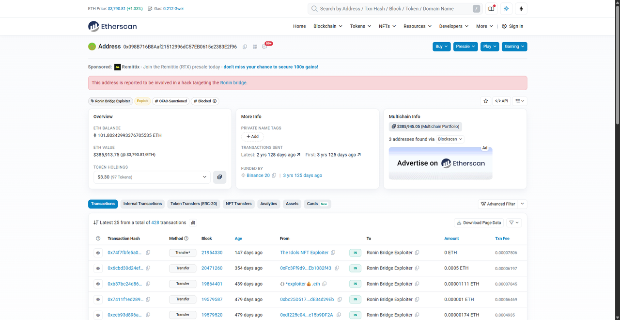 攻击者立即通过去中心化交易所将各种代币统一兑换为ETH,然后将约18,000 ETH分散到14个不同地址,最后通过Tornado Cash分批清洗约85,700 ETH。2023年1月,美国FBI正式确认这次攻击由朝鲜Lazarus Group实施,这也证实了国家级黑客组织已经将跨链桥作为重要的攻击目标。